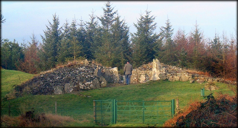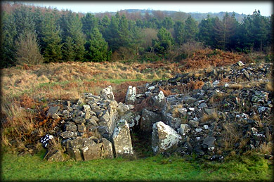 Situated: From Crossmaglen take the B135 north for 1 kilometre and turn right at the crossroads. Drive along this road to a T-Junction; take a left here. After about 300 metres you will see the forestry, on your right. A sign points to the cairn. Drive down and park at the gate, the court cairn is a further 200 metres along the path. Discovery Map 28: H 9044 1785. Last visit Sept 2005. Longitude: 6° 37' 2" W Latitude: 54° 6' 6" N Photos: Jim Dempsey |