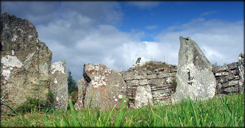 Two subsidiary chambers were added to the northern end of the twenty metre long cairn at a later date. The court is semi-circular and comprised of both large and small orthostats with drystone walling between them. From the picture above you can see the dry walling and one of the large pointed orthostats that give the tomb its local name. |