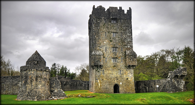 Aughnanure Tower House One of the best preserved and also one of my favourite castles is the tower house built at Aughnanure by the O'Flaherty's about 1500. I had often raved to Deb about this national monument so I was thrilled to finally bring her here. In Irish the castle is known as Caisleán Achadh na nlubhar, which translates to "Castle in the field of the yews". It is a heavily fortified six storey tower house, with a garret, standing on a rocky outcrop on the south bank of the Drimneen River close to the shore of Lough Corrib. The castle is unusual in that it has two bawns. The outer bawn lying to the south and east of the tower was defended by five turrets and bastions.