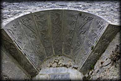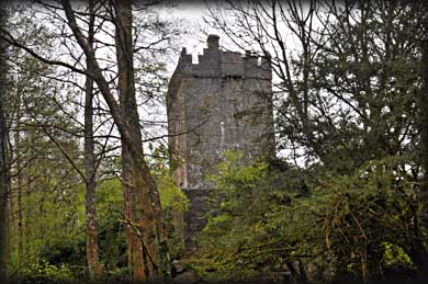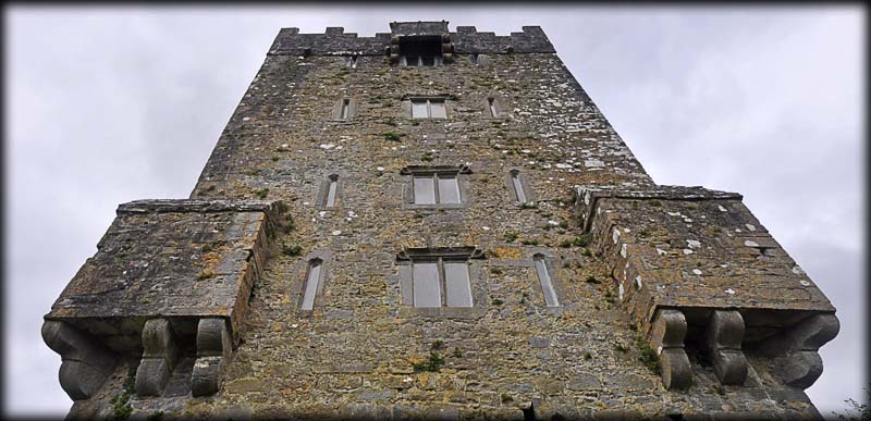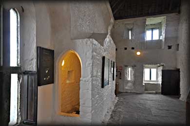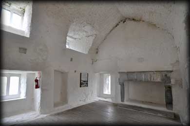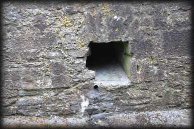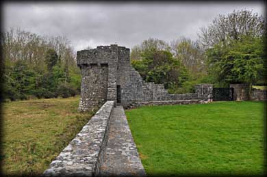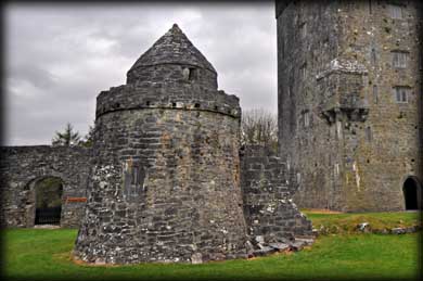 In the southwest corner are the remains of a rectangular 16th century banqueting hall, much of which has collapsed into the dry river which originally flowed below the hall. There are two windows remaining in the hall, the soffit of one window is beautifully decorated with carved grapevines. There are the remains of a gatehouse and drawbridge at the northwestern quarter (See image above). Very little remains of the walls from the earlier wedge-shaped inner bawn apart from a small round turret standing at the southeast corner ( see image below right). It seems totally out of place until you realise there were two bawns. It has a fine corbelled roof and was later reused as a dovecote. At the top of the tower is a gallery that provided a complete view of the courtyard. |
