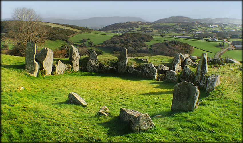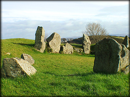 Ballymacdermot Court Tomb This monument is situated on the south side of Ballymacdermot mountain, County Armagh, the court tomb offers excellent views of the Meigh plain and surrounding countryside. As you can see from the picture above the court forms the best part of a circle with the largest stones furthest away from the chambers.