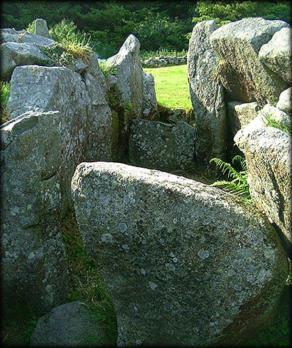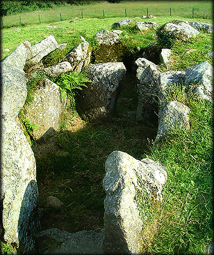 The monument consists of a court and three chambers, the chambers are separated by jambs, these can be seen in the middle picture on the right. The chambers are now roofless but originally they had a corbelled roof, traces of which can be seen in the middle chamber. There is a large part of the cairn still surrounding the gallery. |