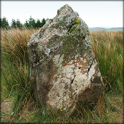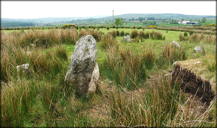 Broughderg Stone Circles and Standing Stone The first time I visited this site was during the winter, the ground was so boggy and soft it was impossible to reach the circles, all I could see was the top of one stone sticking up through the marsh. On my recent visit I was able to approach the circle but to my surprise there are two contiguous circles with a small cairn and standing stone set between them at the north west. The north circle is comprised of ten stones and the southern circle has fourteen stones remaining. It was impossible to photograph the south circle, the stones are low and hidden in the grasses. The standing stone, pictured bottom is approximately 1.5 metres high by 0.75 metres wide and the cairn is about 3 metres across.
