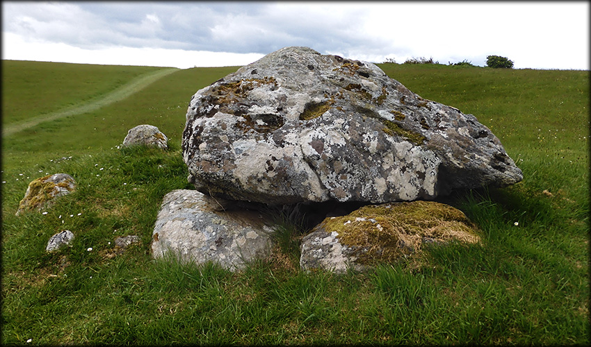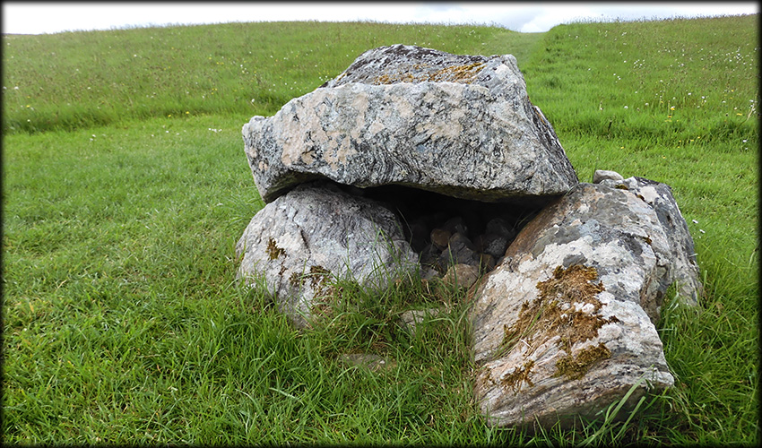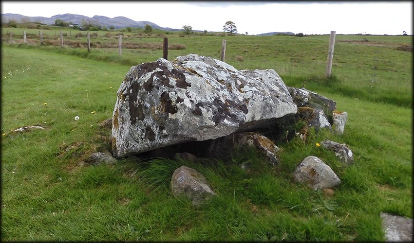 Above is tomb 51, also known as Listoghil, the tomb stands on the highest point of the Carrowmore complex, the only tomb definitely covered by a cairn and also the largest in the cemetery, the cairn is 34 metres in diameter. The tomb was partly excavated in the 1990s by Swedish archaeologist Goran Burenhult. Over the last few years work has been carried out on this huge cairn by the Office of Public Works, exposing the chamber pictured below, which now has a public viewing platform built around it. The chamber that stands inside the cairn is pictured below. |
