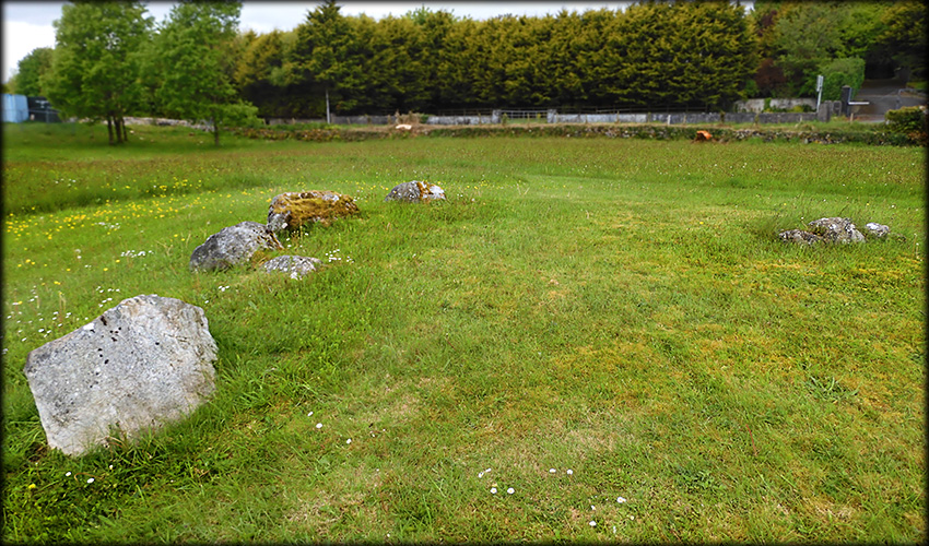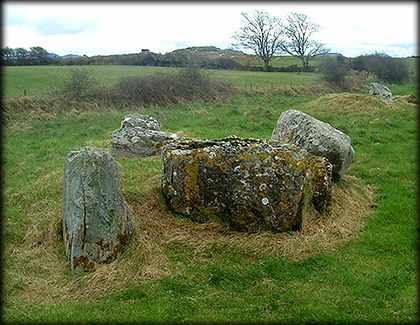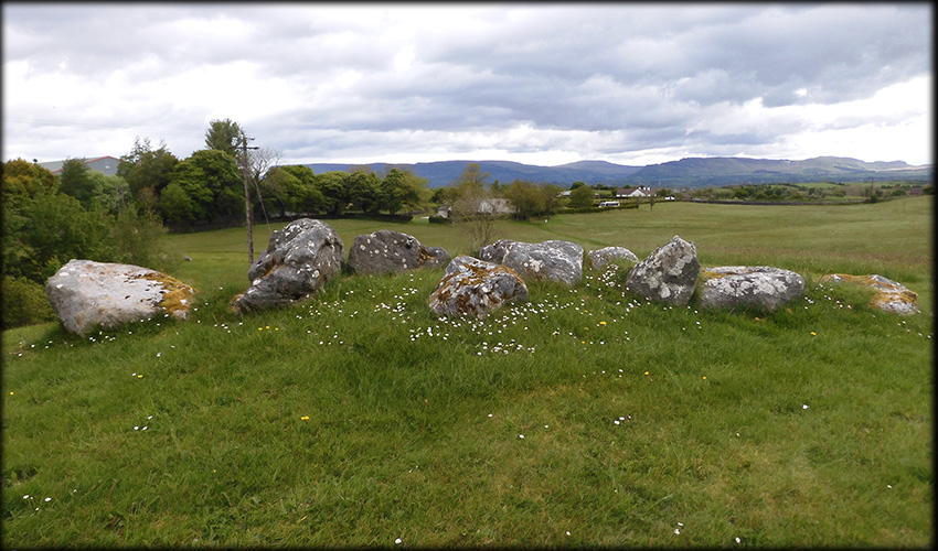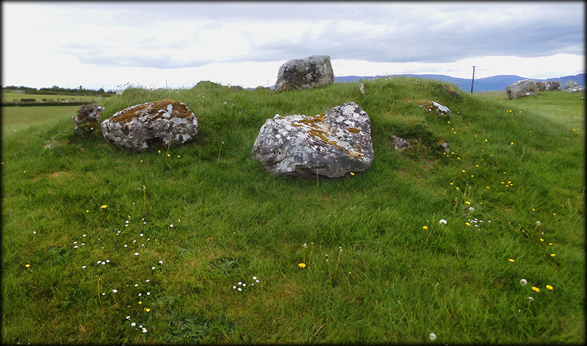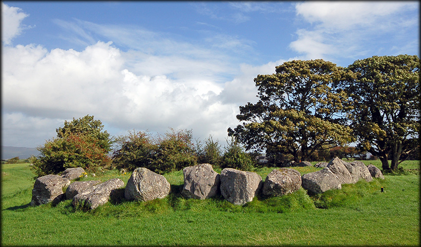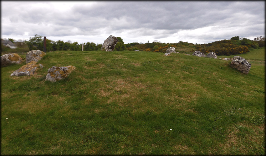 Tomb 57 is just a short distance north of tomb 56. This circle consists of 33 large contiguous boulders and almost 20 metres in diameter. There are no visible signs of a cromleac, which may have been destroyed. part of the circle is on private land. Tomb 57 Longitude: 8° 31' 5" W. Latitude: 54° 14' 60" N |