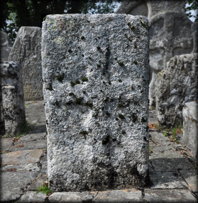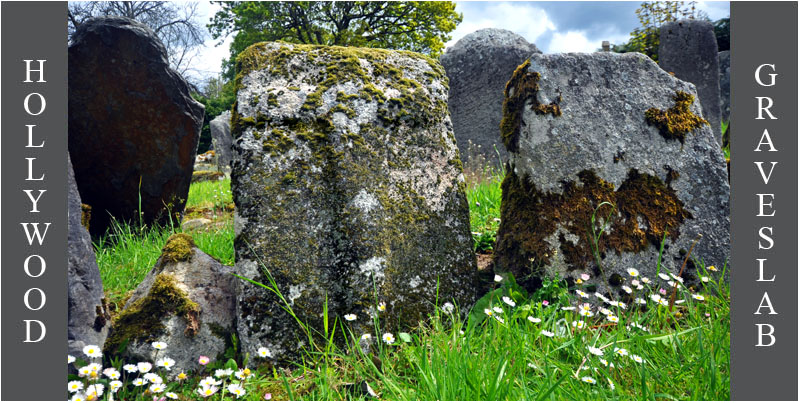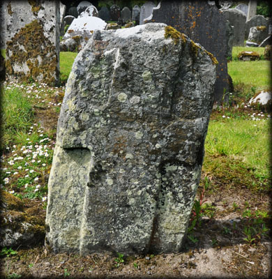 One of the slabs in the graveyard belongs to a group of 13th century graveslabs known as the Hollywood slabs. These granite graveslabs were originally recumbent, with a splayed cross carved at one end with a long shaft terminating in a small cross. It is believed this slab, now covered in moss, may have been reused as a grave marker and inserted into the ground with the main cross now buried. The cross in on the west face. Harbison slab No 6. |