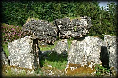 Magheraghanrush Court Tomb Magheraghanrush or Deerpark Court tomb as it is also known, stands on a ridge surrounded by forest plantation. The tomb has a 15 metre long oval court with a single gallery at the west end and two double chamber galleries at the east end. At the entrance to two of these chambers the lintels have fallen, one lintel remains but as you can see from the picture top left, this one has split. This particular court tomb has a passage entrance on the south side.