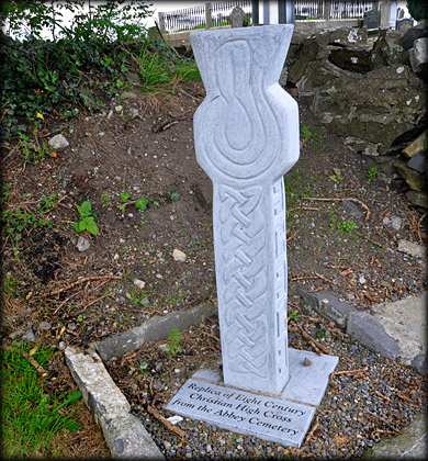 Abbeyshrule Cistercian Monastery An Abbey was founded in Abbeyshrule in 1200 under the patronage of the O'Farrels of Annaly. It was colonised by Cistercian monks from Mellifont. In 1228 the affiliation changed to Bective Abbey. All that remains today is the ruined rectangular Abbey church, with traces of a cloister garth to the south, the foundations of the Presbytery and evidence of a south transept. The ruin of an ivy clad 16th century residential tower stands in the south east corner of the enclosure. In the 15th/16th century the arch in the central dividing wall was blocked up and three small barrel vaulted chambers were added, see bottom image. A double bellcote was also constructed over the arch. Situated by the roadside to the east of the entrance is a poor replica of an eighth century High Cross that has been removed to the sacristy of the R.C. Catholic Church in Abbeyshrule. The cross was originally located in the graveyard next to the abbey. It is an armless sandstone cross with the upper part of the cross expanding outwards. Standing at only 0.97 metres high by 0.27 wide it has been described by Harbison as a thistle-shaped cross. The west face of the shaft, pictured right, is decorated with interlace. The head bears an unusual circular band design that extends on to the upper limb. The North and south sides bear a greek fret design. The cross has been compared to the small crosses at Layd in County Antrim and the small cross at Laughanstown in Dublin. We did not know the location of the original cross on this visit but hopefully we will be able to view and photograph the cross on our next visit to Abbeyshrule. It is well worth a wander around the abbey grounds as there are a number of interesting cross slabs present in the graveyard. |