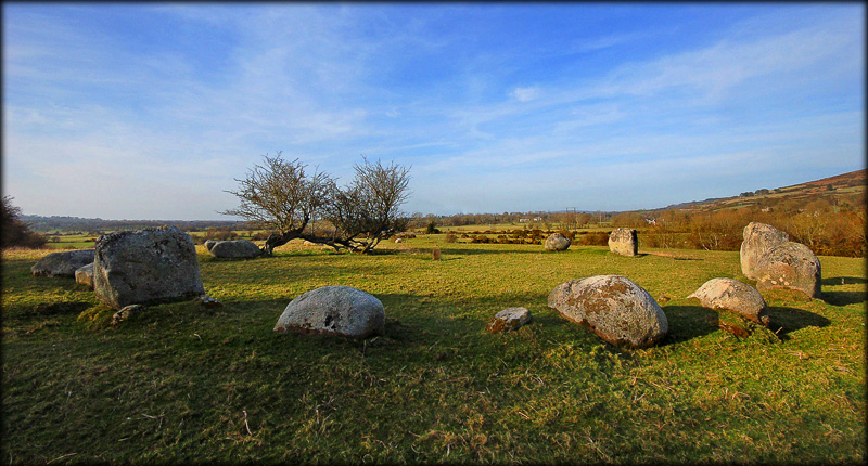 | When you first enter the field from the roadway there are a number of stones in the field on your left hand side. It is believed that there may have been another circle in this area, some of the stones are placed a megalithic yard apart. Athgreany - Achadh Greine - translates as 'Field of the Sun'. Legend says a group of merrymakers were dancing to the pipers tune on the sabbath when God turned them to stone, the outlier being the piper. An old thorn tree also grows on the circumference. These are usually associated with the fairy folk in Ireland. I have always thoroughly enjoyed visiting this site, it exudes a wonderful atmosphere. | ![]() |