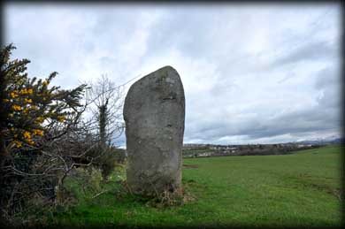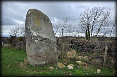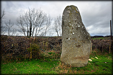 Situated: From Rathfriland head west on the Redbridge Road. After 800 metres turn left onto Longstone Hill. Keep right at the fork and about 600 metres down the road you will come to a house on the left. There is a track before it. The stone is in the field on the left of the track. Discoverer Map 29: J 1716 3303. Last visit Mar 2013. Longitude: 6° 12' 11" W Latitude: 54° 13' 58" N Photos: Jim Dempsey and John Donnellan. |