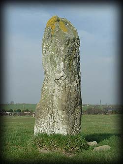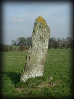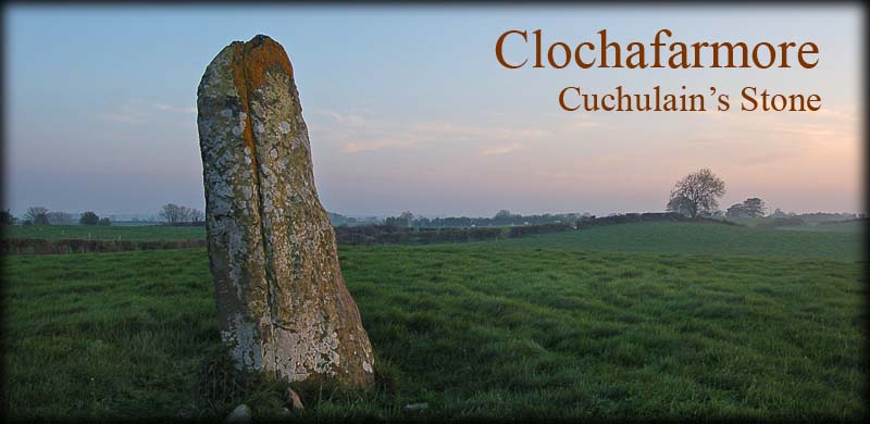 Clochafarmore Standing Stone This very impressive stone stands very proud on a slight hill overlooking the surrounding fields, standing at over 3 metres high and about 1.3 metres wide this standing stone is traditionally associated with CuChullain the legendary hero of "The Tain Bo Cuailgne" an old Irish saga. Folklore: According to legend CuChullain was mortally wounded when single handedly fighting off the army of Queen Maeve of Connacht, he tied himself to the stone to stay upright and face his enemies, who would not approach him, after a few days a raven landed on him and they realised he was dead. |