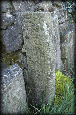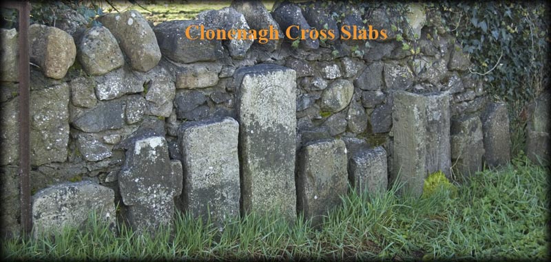 Clonenagh Cross Slabs, Holy Well and St Fintan's Tree. A monastery was founded at Clonenagh by Saint Fintan who died in 603 AD. Saint Fintan lived a very austere life as a hermit in Clonenagh County Laois. Many disciples became attached to him and he soon became their abbot, amongst them was Saint Comgal. The austerity was so severe at the monastery that many surrounding monasteries were to complain that they could not keep up with them. Very little remains of the monastery now but amongst the most notable are various cross slabs lying against a wall in the old graveyard. Across the road, slightly west of here, are the ruins of a church and a holy well. Standing just outside the graveyard is a stump of a tree known as Saint Fintan's Tree. |