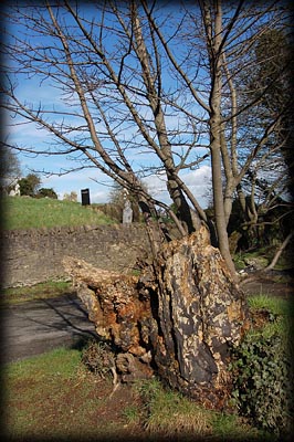 The tree was planted over 200 years ago inside the area of the old monastery, when the nearby well which also venerated Saint Fintan was closed, a spring appeared in the fork of the tree and this became a focal point for "Patterns" for many years. A custom developed of inserting coins into the bark of the tree which led to it's decay, but a number of shoots have been salvaged in the hope of prolonging the life of the tree. Situated: From Dublin take the M 7 South. Clonenagh is situated along the N7 halfway between Cloneen and Mountrath. Discovery Map 54: S 3889 9575. Last visit Mar 2007. Longitude: 7° 25' 14" W Latitude: 53° 0' 40" N Photos: Jim Dempsey. |