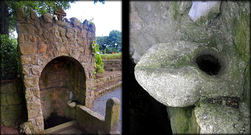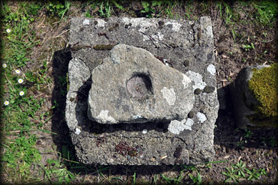 Graveyard The 35 antiquities catalogued by Harbison included twenty four cross slabs. I did not locate no 5 and slab number 31 was reused as a lintel at Clonmore castle. The other antiquities are as follows; No 2 is a granite slab with a perforation. No 4 is a lintel with a rolled moulding. No 11 is an ogham stone, 12, 13, 26 and 32 are all pictured on the high cross page. No 33 is now missing, No 34 is the holy well, pictured below, and No 35 is the large bullaun stone by the river. That leaves No 14, pictured bottom of the page left, It is known locally as 'the Chalice stone' and along with the lintel stone No 4, they may be all that remains of the early church. It looks like a pivot stone for a wooden doorway. They can be mistaken for bullaun stones, but the sides of the depression are steeper. |