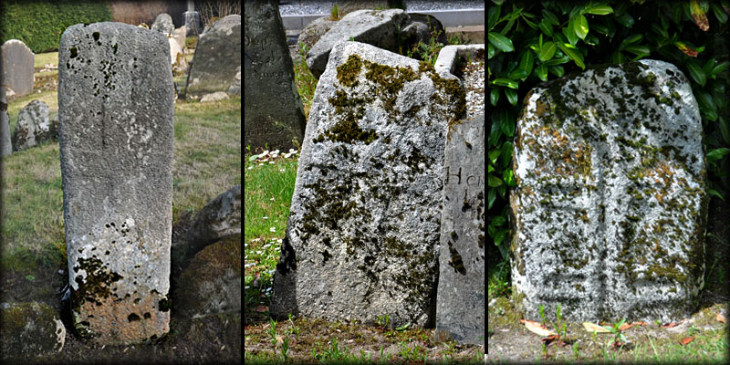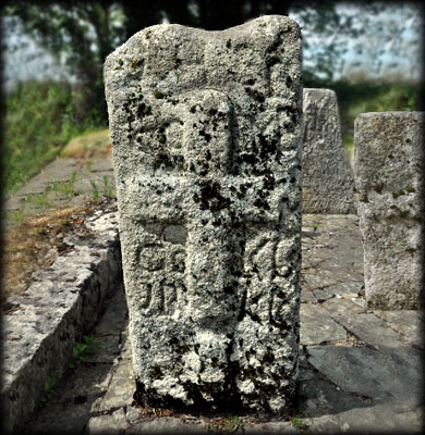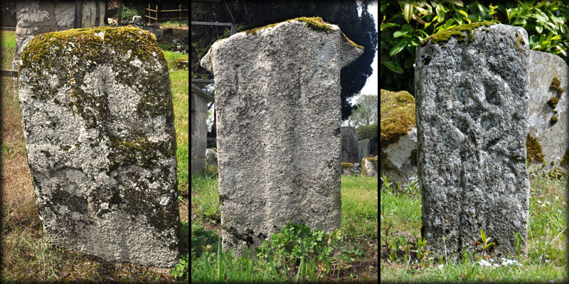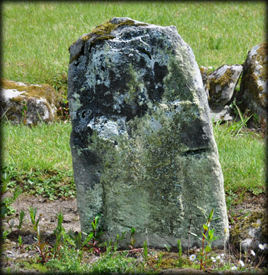One of the slabs in the graveyard belongs to a group of 13th century graveslabs known as the Hollywood slabs. These granite graveslabs were originally recumbent, with a splayed cross carved at one end with a long shaft terminating in a small cross. It is believed this slab, now covered in moss, may have been reused as a grave marker and inserted into the ground with the main cross now buried. The cross in on the west face. Harbison slab No 6. |