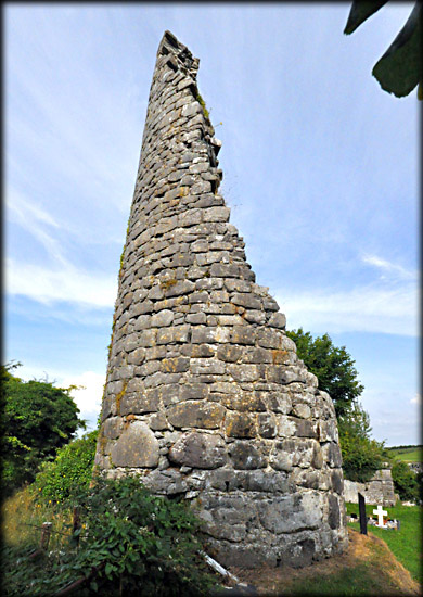 There are floor corbels visible on the first and second floors. The lowest 1.5 metres of the tower was constructed using large irregular shaped boulders with regularly coursed boulders above. The ground level is much lower on the northside but impossible to view as the tower stands on the boundary between the cemetery and private farmland. There is a barb-wired fence preventing access to the northside field. The large breech in the tower makes for a very dramatic ruin. |
