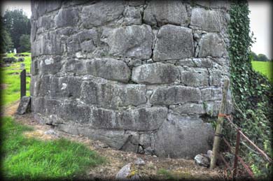 Drumcliff Round Tower I had planned to visit the round tower at the monastic site on Scattery Island but because of the 'Celebrate Scattery Festival' I was unable to get a boat till late in the afternoon, so I decided to visit some other monastic sites near Ennis. These sites included the round towers at Drumcliff, Killinaboy and Dysert O'Dea. There is very little known about the history of Drumcliff, but the site has always been associated with St Conald. The church and round tower are situated on a steep slope in the old cemetery. There are no features like windows or doors remaining but what is left of the drum is quite revealing about the construction of round towers. The drum is 2.4 metres high on the southside and rises to 11 metres high on the northside. The inner and outer faces of the drum are filled with mortared rubble, forming the traditional sandwich construction.