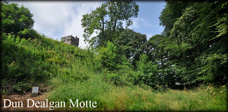Dun Dealgan/Castletown Norman Motte This enormous circular motte is situated on a ridge to the west of Dundalk town. It is also known as Cúchulainn's Castle which suggests the motte may have been built on top of an earlier earthworks. The steep-sided mound rises to a height of about 10 metres and has a wide fosse and high earthen bank surrounding it. It was probably built in the late 11th century by Bertram de Verdun. There are signs of a small D-shaped bailey at the northwest. Earlier records show a larger bailey to the east of the fosse. There is a souterrain set into the motte about halfway up the track leading to the top. This may have been part of the earlier earthworks. a prominent |