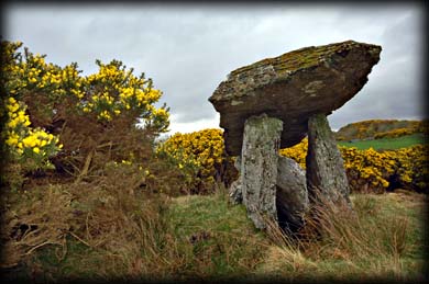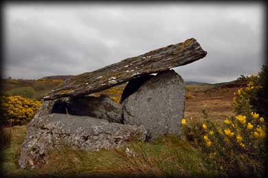 Gortnavern Portal Tomb We decided to try and visit the monument at Gortnavern from the west instead of the sign-posted eastern route which is now quite overgrown and also involves crossing a stream and some rather boggy land. On a previous visit I only managed to view the megalith from a distance. I just hoped the route I drew up on the map worked out. We parked the car at the entrance to a field and walked up a track through two gates and onwards up the field following a trail. I knew from images that the tomb was surrounded by gorse, after about 250 metres we came to a lot of gorse on our left. We ventured into the field and there also on the left stood this fine example of a portal tomb.