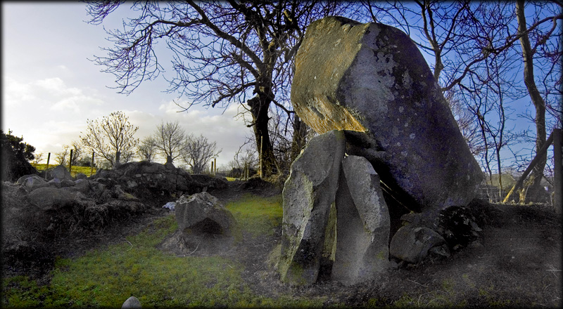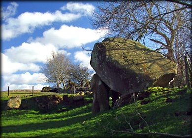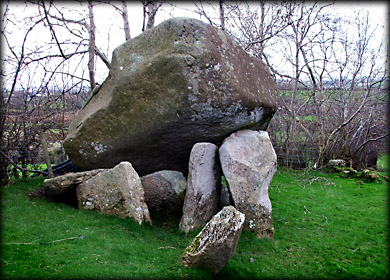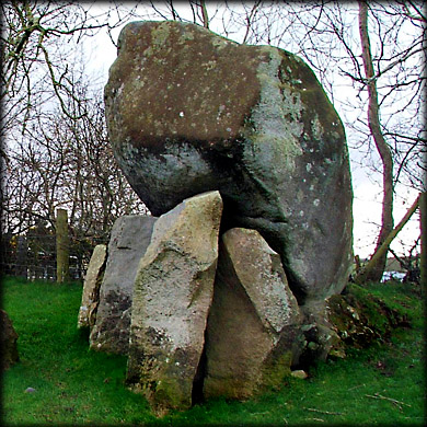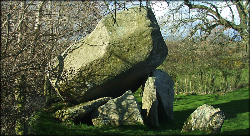 Situation: From Newry take the B8 west for Hilltown, drive straight through Hilltown staying on the B8 heading for Castlewellan, after approx 3 kilometres, about 1 kilometre past the church, there is a right turn sign-posted Goward dolmen. Follow the signs till you come to a small car-park next to the dolmen. Discovery Map 29: J 2430 3103. Last visit Jan 2008. Longitude: 6° 5' 40" W Latitude: 54° 12' 47" N Photos: Jim Dempsey. |