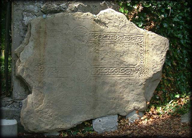 Near the cross are some 9th-10th century cross slabs, one of which is shown above. The Church is on private ground and the Cross and Slabs are surrounded by large trees.