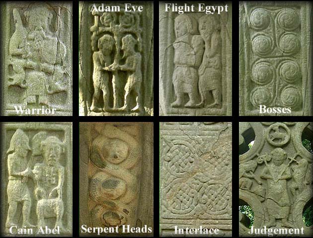 Above is a selection of panels from the High Cross, The warrior with plaited beard and two dogs is on the south side. The iconography showing Adam and Eve and Cain and Abel are also on the south side of the shaft. The Heads with the interlacing serpent are under the ring on both the north and south sides. The Flight into Egypt is immediately below the eight spiral bosses on the north side of the High Cross. The last judgement and the interlace panel both appear on the east face. |