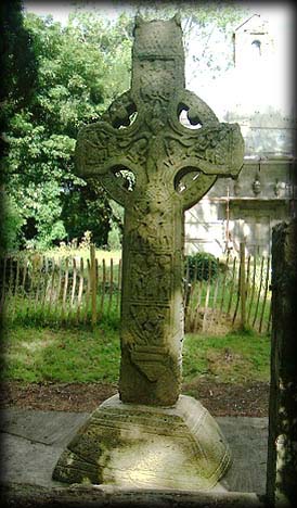 Durrow High Cross In the middle of the 6th century a monastery was founded here by St Colomba, the monastery is famous for an illuminated manuscript, written here in the 7th century, known as the Book of Durrow. West of the Church is a fine High Cross, the East face is pictured on the right, the head features Christ with sceptre and cross -staff, associated with the last judgement, and on his left a piper and David with his harp. On his right David and the lion are depicted. The bottom of the shaft on the East face shows the raised Christ flanked by two angels hovering above St Peter and St Paul. The central panel is a beautiful celtic interlace and the top panel bears the sacrifice of Isaac.The west face as usual has the Crucifixtion on the head and also the arrest of Christ. This is a fine cross standing at 3.60 metres.