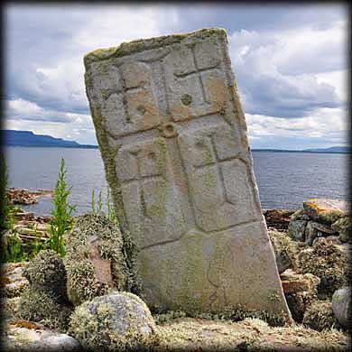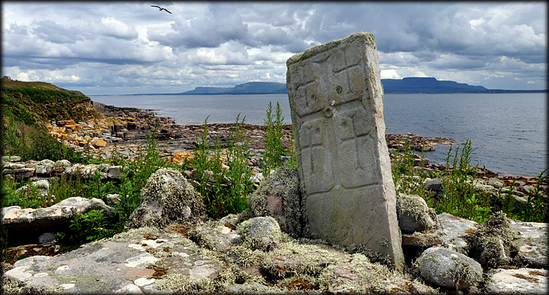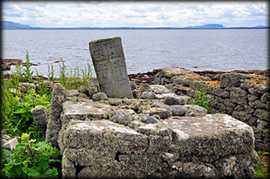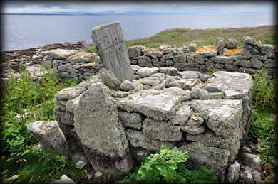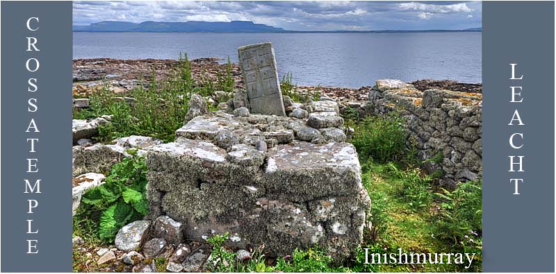 Inishmurray Crossatemple Leacht, AKA 'Station of Mary' This Leacht is situated at the southern end of the women's cemetery. The rectilinear cairn is quite close to the cliff-edge. Sitting on top of the leacht are some rolled stones similar to those at the Clocha Breaca Leacht, but none of these are decorated. Also erected on the cairn is a beautifully inscribed Cross-Slab. The upper part is decorated with an inscised central cross. In the centre of it is a dimpled boss in false relief. In each quarter is a crosslet, inscised in a similar style to the main cross. The decorated slabs on the island are truly amazing, one can only imagine what it must have looked like with all ninety slabs/pillars in situ. Some of the designs are unique to Inishmurray, but there is similar cross-inscribed slab on the mainland at Kilmacannon that may have had connections to Inishmurray. The view to the mainland from here is stunning with Benbulben looming in the background.