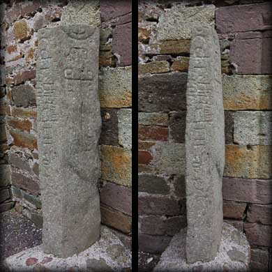 The Alphabet Stone Now erected inside the church next to the chancel arch, the alphabet stone stands at 1.22 metres high, the stone was originally taller but the top has been broken off. The west face of this stone is inscribed with the latin alphabet in half uncial script dating to the 6th century and an earlier inscription with the letters DNI meaning Domini. The south face shown right, has an inscribed Latin cross with scrolled terminals. The north face has an inscribed cross but only a scrolled terminal and stem remain. This would have been a beautiful inscribed stone when it was originally carved. It is very hard to photograph this stone without proper lighting. There are a number of other carvings situated around the inside of the church.