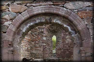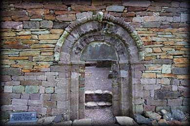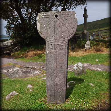 Access to the church is through a gorgeous inclined romanesque doorway. It has three orders and a round head with a projecting hood made from red and green stone. The green keystone, seen in the image left is a carved head. Inside the Nave there is blind arcading also similar to Cormac's Chapel. The Chancel arch pictured below, is also beautifully decorated in the romanesque style. The Saint's Road, a pilgrimage trail to Mount Brandon passes between the Church and St Brendan's House. Give yourself plenty of time if you are planning a visit as there are so many interesting antiquities here at Kilmalkedar. Amongst them, the Alphabet Stone, a holed ogham stone, a sun dial, a large stone cross, two Holy Wells, two Bullaun stones, St Brendans Oratory and numerous cross slabs. |