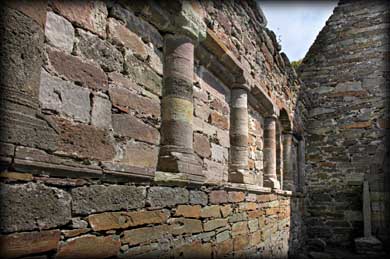 Romanesque Church This Early Christian and later Medieval site is spread over a large area of around 10 acres. Although the history of this site is associated with St Brendan it is thought to have been founded by St Maolcethair, a local saint. At the centre of this area is the 12th century Hiberno-Romanesque Church pictured right. It consists of a Nave and Chancel wth the chancel being a later addition. The church is thought to have been modeled on Cormac's Chapel at Cashel and there are many similarities. The church like Cormacs Chapel is one of a number of stone-roofed churches in Ireland. The first thing to look out for are the three finials sticking up above the gables. |