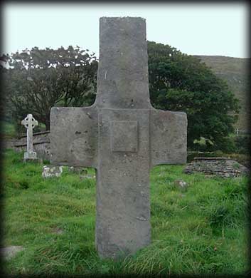 This pillar stands at 1.23 metres high and the rectangular shaft and the semi-circular head have a smooth finish. The south east face of the head is divided into four equal sections by lines radiating from the gnomon hole. The north west face of the head is decorated with a cross of arcs. It is now believed that the cross of arcs was a symbol of pilgrimage. The symbol appears on many stones associated with pilgrimages or pilgrimage routes. The sundial is situated on the outh side of the pathway as you approach the church and very close to the Saints Road. Near to the pilgrimage site at Ballyvourney in county Cork is another stone bearing the cross of arcs. Sundials are also present at a number of other christian sites including Monasterboice in Meath, Toureen in Tipperary and Clone in County Wexford. |