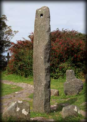 Ogham Stone Situated on the northern side of the pathway that leads you to the romanesque church this wonderful holed ogham stone stands at 1.83 metres in height and measures 0.24 metres in width at the base. The inscription reads, ANN M(AI)LE INBIR MACI BROCANN A second inscription on the south side reads either ANM or M(A)QI. This stone may have been a standing stone with the ogham writing added during the early christian period. I love this particular stone, it adds so much more interest to the site. There are a number of standing stones with holes, Doagh in Antrim , Cloch a' Phoill in Carlow and this early christian pillar stone at Gleanncholmcille are excellent examples. |