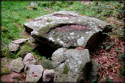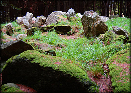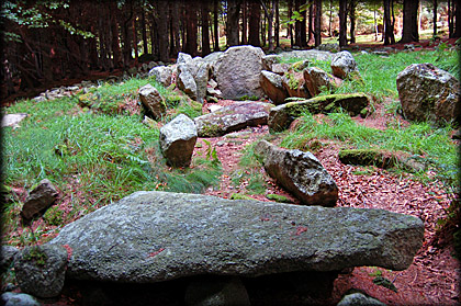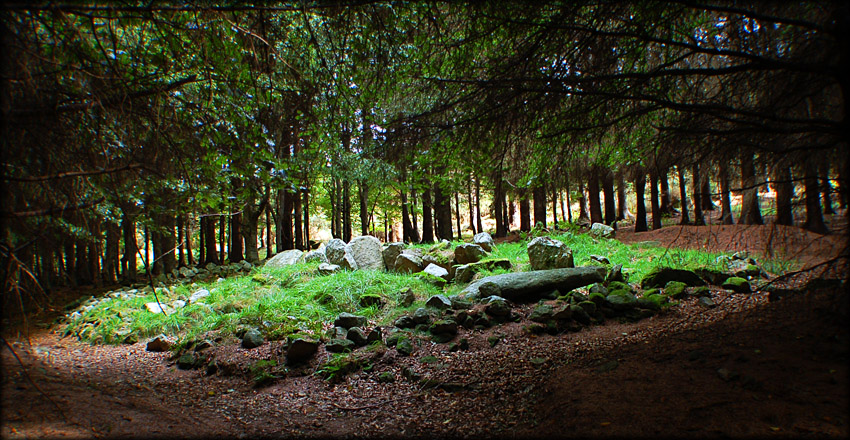 Situated: From the M50 take the Knocklyon exit, head east on the R133, turn right at the next crossroads after the R116-Whitechurch Road. Drive up here keep left at the roundabout, under the M50 flyover turn left at the roundabout. Drive up to a small car park on your left. Cross the road to the small track going up into the woods. The cairn is 50 metres up this track. Discovery Map 50: O 1503 2439. Last visit Sept 2006. Longitude: 6° 16' 34" W Latitude: 53° 15' 27" N Photos: Jim Dempsey. |