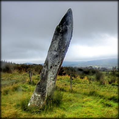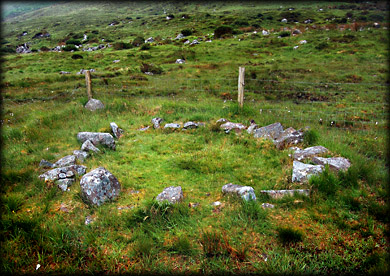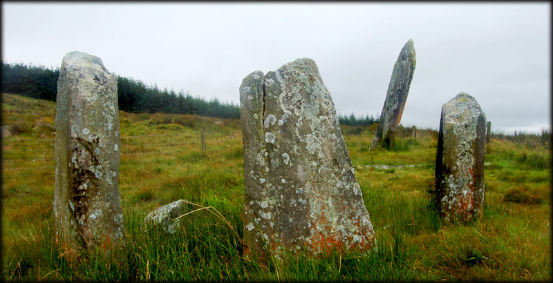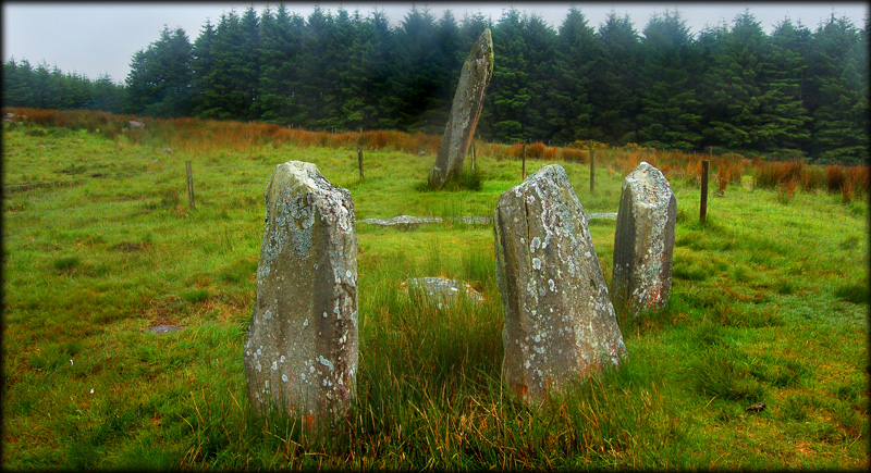 Knocknakilla Stone Circle, Standing Stone, Ring Cairn. I was really looking forward to seeing the site at Knocknakilla, but as you can see from the images the weather was awful the day of my visit. I had just been to the Cloghboola Beg site inside Mill Street Country Park, Knocknakilla is about a kilometre from the entrance to the park on the northern slopes of Musherabeg. The circle is a five stoner, but only the portal stones and the western side stone remain standing, the recumbent is now lying prostrate. South-west of the circle is a large standing stone, one of a pair, the other lies prostrate between it and the circle. East of the circle a small radial cairn was discovered during peat-cutting in 1970. I will definitely visit again as the weather was a lot worse than my images suggest.
