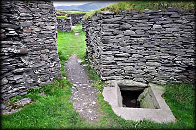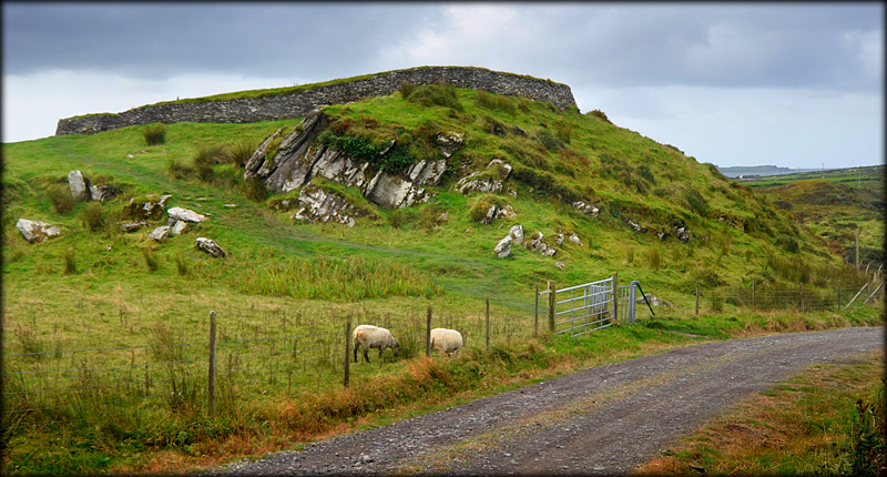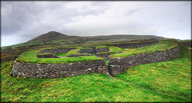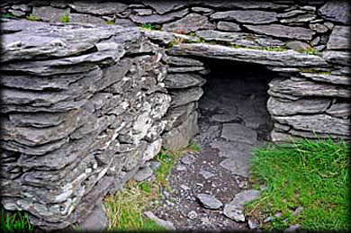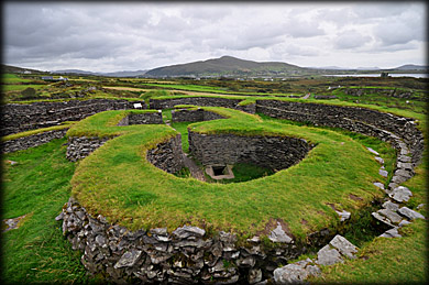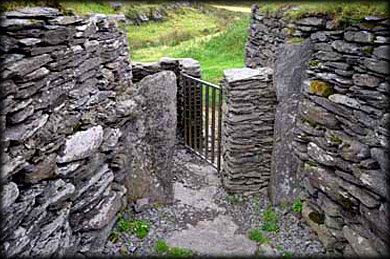 Leacanabuile Stone Fort This cashel is prominently perched on top of a small rocky outcrop with commanding views of the surrounding countryside, just 375 metres north of Cahergal. The name is derived from the Irish Leaca na Buaile meaning Slope of the Booley - Summer Cow Pasture. Follow the track around the northside of the outcrop to reach the entrance in the east wall, pictured above. The 2.5 metre thick walls of this 9th/10th century fort have been reconstructed to a height of about 2 metres and above in places. |