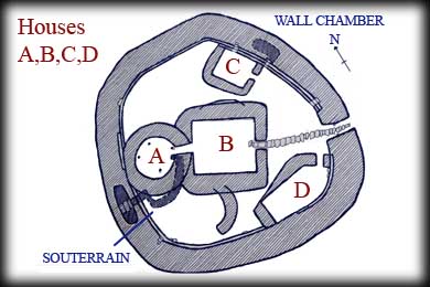 Inside the fort are the remains of four houses reconstructed to about the same height as the walls of the cashel. The oldest of these houses is a circular hut that abuts the west wall of the cashel. Inside the hut is the entrance to a souterrain that leads to a chamber in the west wall and four large post holes. These posts may have acted as supports for a timber roof. The largest rectangular hut, B in the diagram below, was added later, as was the two other huts C and D. There is another chamber in the east wall of the cashel. A covered drain runs from the rectangular hut to the forts entrance. Amongst the variety of finds during excavations inside the fort were Whetstones, Quern-stones, Mill-stones and some Iron knives. |