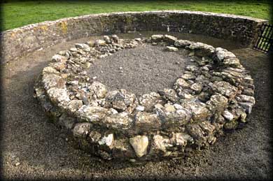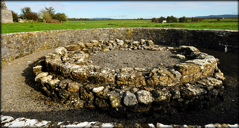 Liathmore Round Tower The round tower at Liathmore was discovered during excavations in 1969-70. It lies equidistant between the two remaining medieval churches at Liathmore. The tower is southwest of the 11th century church at an unusually acute angle to the western doorway. During the excavations they found worked ashlars from the drum and these were used in the reconstruction of the first layer of stones resting on the foundations. At 2.6 metres deep the foundations are quite deep compared to most other round towers leaving us with questions as to why this tower collapsed. |