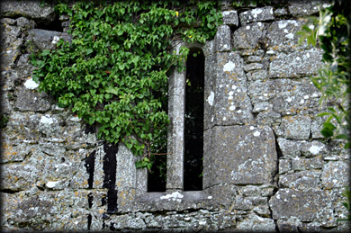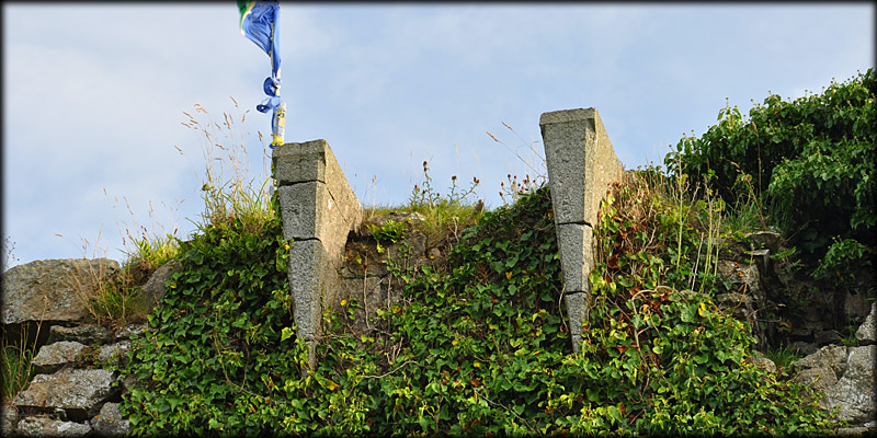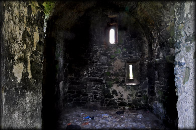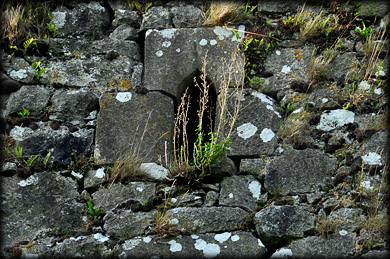 At first glance a breech in the east wall gives the impression of a doorway, but the doorway is actually in the north wall, facing the church. At the top of the north wall the corbel stones that supported the machicolation are still present, see image below. The doorway was also protected with a murder-hole. A mural stair to the right of the entrance leads to the upper floor. A garderobe shute can be seen at the bottom right of the west wall, pictured above. The battlements are now missing. A lot of the window openings have been robbed out, but there are some nice corner slits in the south east angle. |