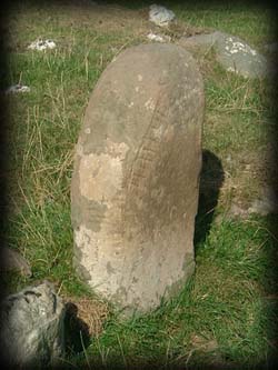 The most northerly of these two stones pictured right, is a pulvinar standing at 0.8 metres high and 1.3 metres in circumference this Ogham stone bears the inscription, GOSSUCTTIAS The ogham stone immediately South of this stone is also a pulvinar but looks like a standing stone from the North as the stone has been split longitudinally, pictured below, from the South side the inscription reads, GAMICUNAS This stone is 0.8 metres in height, 0.45 metres wide and 0.24 metres thick.
