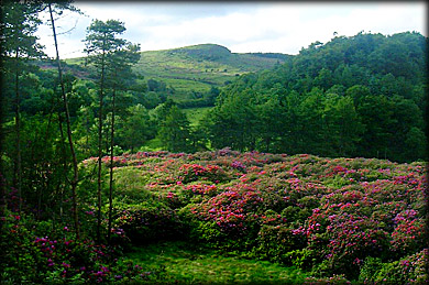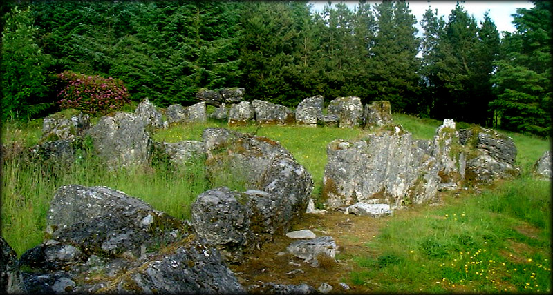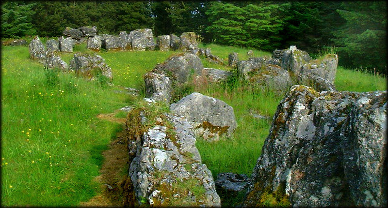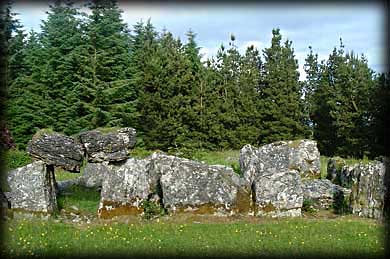 Magheraghanrush Court Tomb Magheraghanrush or Deerpark Court tomb as it is also known, stands on a ridge surrounded by forest plantation. The tomb has a 15 metre long oval court with a single gallery at the west end and two double chamber galleries at the east end. At the entrance to two of these chambers the lintels have fallen, one lintel remains but as you can see from the picture top left, this one has split. This particular court tomb has a passage entrance on the south side.