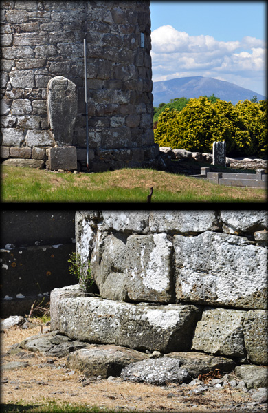 Meelick Round Tower I was really delighted to find the round tower at Meelick was situated in a hillside graveyard, with splendid views of the surrounding countryside. Nothing is known about the foundation of the original monastery and the only remaining evidence of the monastic site is the tower and a superb cross slab attached to eastern side of the tower. At first sight the tower, which stands at 25.5 metres high, is truly impressive. Built of evenly coursed limestone this stunning monument appears to reach right up to the heavens, even without it's missing cap. The southeast facing arched doorway has an extremely long sill stone with inclining jambs. The arch is comprised of 5or 6 voussoirs. A modern metal gate has been added to the doorway. There may have been five or six floors in the drum. Although the bell storey windows are missing there are six windows remaining in the drum. The lower two windows are angled headed and the upper four lintelled. Two offsets are visible on the northwest side of the tower, see bottom image. An added bonus to my visit was the wonderful cross slab. It is ornately decorated with superb interlacing design and bears an inscription. The last few letters are quite worn and difficult to make out. Research has not helped identify the name at the end. It reads either 'OR DO GRICOUR' - a prayer for Gricour, or 'OR DO GRIENI'. A visit to this impressive monument is strongly recommended. |