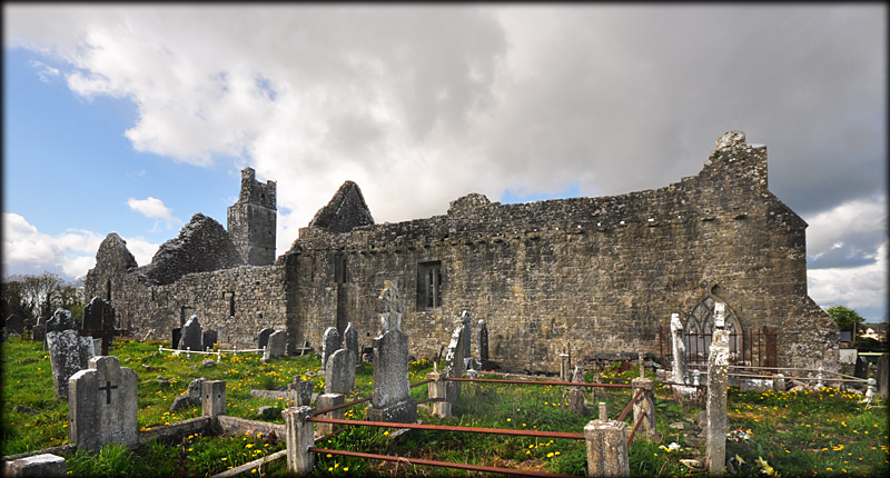 Mungret Abbey Pre-Norman church St Nessan established a monastery here in the 6th century. It is believed there were as many as six churches and about 1,500 monks here at one time, but sadly the abbey went into decline after many viking raids and was destroyed by Donal McLoughlin in 1107. It later became a parish church under Augustinian Canons. This is the second and largest of the churches at Mungret. According to a plaque on the north wall this Pre-Norman church is not later than the 1100 AD. There is a lintelled doorway with inclined jambs leading into the nave, which is the oldest part of the church. Unfortunately the gates into the church were locked. The building was extended and the tower, the priest's living quarters, was added during the 15th century.