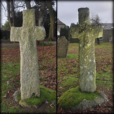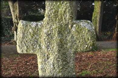 Newcastle Stone Cross In the graveyard are St Finian's Church are a number of interesting stone monuments. Amongst them is this granite cross standing a 1.64 metres high. The cross tapers in from the bottom of the shaft to the top. At first glance the cross looked quite plain, but as I wandered across the graveyard towards the church, I noticed there was a badly weathered carving on the east face. I used some off camera flash to try and bring the carving out. You can just make out a circle with a worn cross in the centre. The west face of the cross, pictured immediate left, bears another weathered carving of a latin cross. The shaft is set in a boulder type granite base. To the south of the cross is a pillar stone, that may have marked a pre-Christian burial. The pillar stone, the norman motte, in the adjoining field, and the medieval church, all point to St Finian's of being a multi-period site. |
