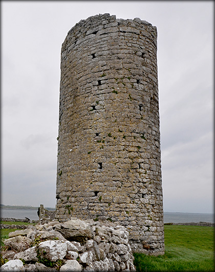 Roscam Round Tower This four storey round tower is situated inside a large ecclesiastical enclosure on the shore of Oranmore Bay. This site has associations with St Patrick and St Odran, a brother of St Ciarán of Clonmacnoise. The D-shaped enclosure is 200 metres N-S and 190 metres E-W with the tower standing in the northern section. It is 10.98 metres high with a plain square headed doorway, facing the southeast, located just 1.1 metres above the present ground level. An interesting feature of the drum is the presence of putlog holes in the external masonry, these were normally used for temporary scaffolding during construction. Because the putlog holes are still visible, plus the addition of a parapet to the top of the drum, it might suggest that the tower was unfinished. We do know that the monastery was attacked by norse vikings in 807, but little else is known about the history of this beautifully located site.