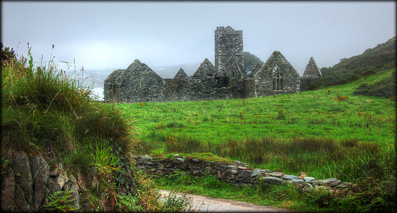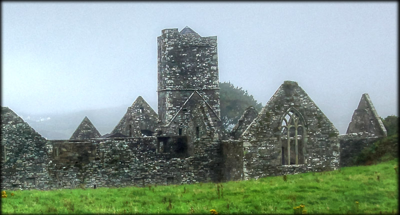 Sherkin Island Franciscan Friary A local chieftain Fineen O'Driscoll founded the friary on Inisherkin in 1449, but there is no record of the building until the 1460s. The nave and chancel church is separated by an inserted tower. A cloister is situated to the north of the church with several domestic buildings around it. The axis of the nave is not directly east which is the norm but is about 30° to the north. Another oddity is the placement of the main doorway in the southern wall rather than the usual west wall. The southern transept has two side chapels. The building was attacked and burnt in 1537, but subsequently repaired.