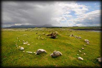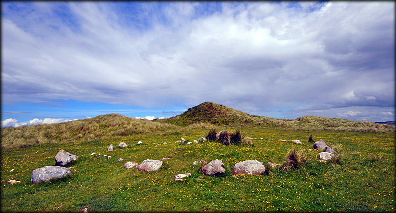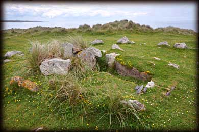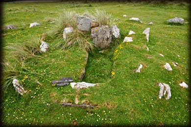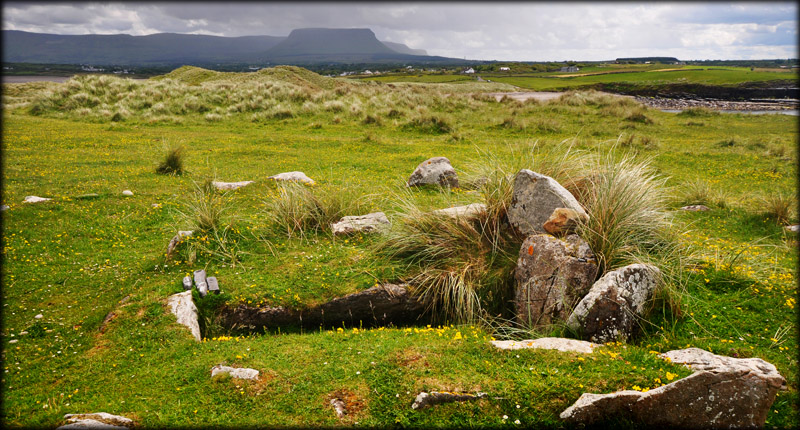 Streedagh Wedge Tomb This small wedge tomb is located on a small headland at the northern end of Streedagh Beach. The tomb was exposed after a storm. It is comprised of a small 2 metre long by 1 metre wide chamber with double walling. The outer kerb is best preserved at the southwest where thirteen stones remain. In the image below you can see two entrance stones and a door slab also at the southwest. In the background is Ben Bulben. The views of the Sligo coastline are quite stunning. My next destination Inishmurray can also be seen from here.