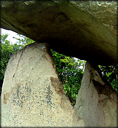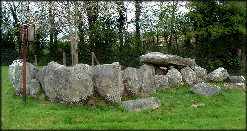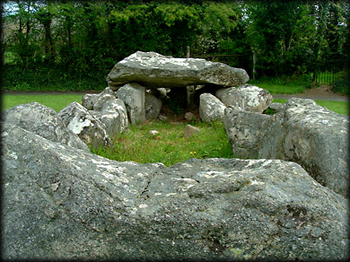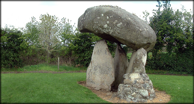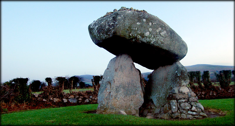 Folklore: Known as the Giant's Load, it is believed it was carried to here by the Scottish giant named Parrah Boug McShagean, who is said to be buried nearby. The Local tradition is to throw a small stone onto the top of the capstone, if it stays there, you will be married within the year. Longitude: 6° 20' 54" W. Latitude: 54° 2' 14" N portal tomb |