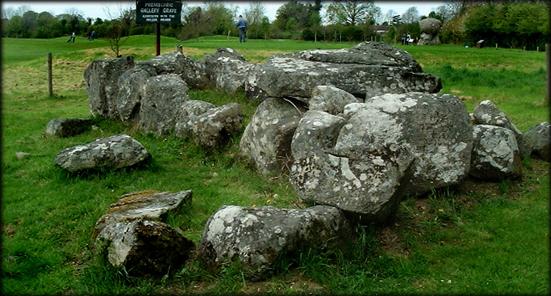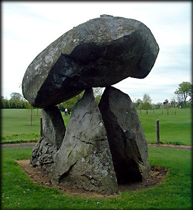Proleek Portal Tomb and Wedge Tomb Situated on a golf course at the Ballyscanlan Hotel, County Louth, the Proleek portal tomb is one of the most photographed dolmens in Ireland. Standing at around 3.5 metres this huge megalith has a capstone 3.8 metres in length and weighing at least 35 tons balanced on three uprights. It has the appearance of a tripod dolmen with it's two portal stones and a third stone at the rear, see Legananny or Ballykeel in County Armagh. The third stone is actually the only remaining sidestone and the backstone is missing. The sidestone has been buttressed with other stones crudely cemented into the ground. The matching Portal stones are really impressive, each standing over two metres high. The tomb is facing north west.