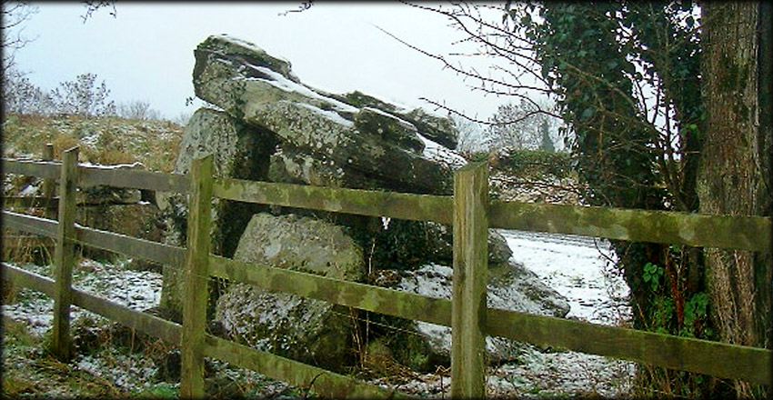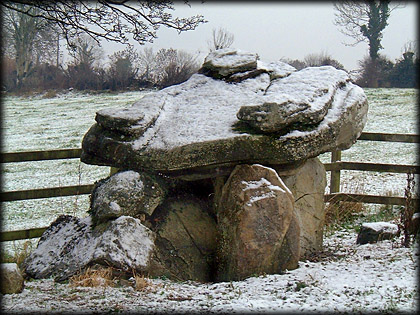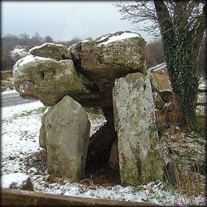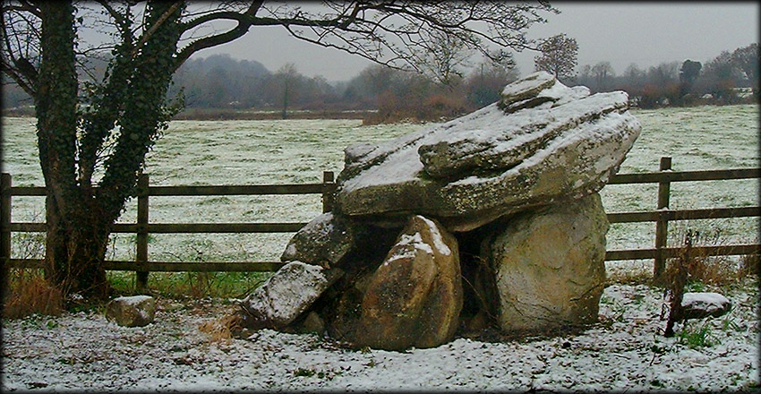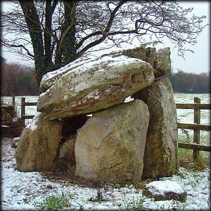 Annaghmore Portal tomb 30th December 2003, my last trip of the year, I decided to visit some easily accessible sites. This gorgeous little portal tomb was the second on my list for the day. Situated in a roadside niche not too far from my first point of call, the ogham stone at Cloonmorris, I was really impressed with this small compact portal tomb. Maybe it was the snow or the donkeys in the field behind me but I was delighted that I had made the effort to visit this particular megalithic tomb.